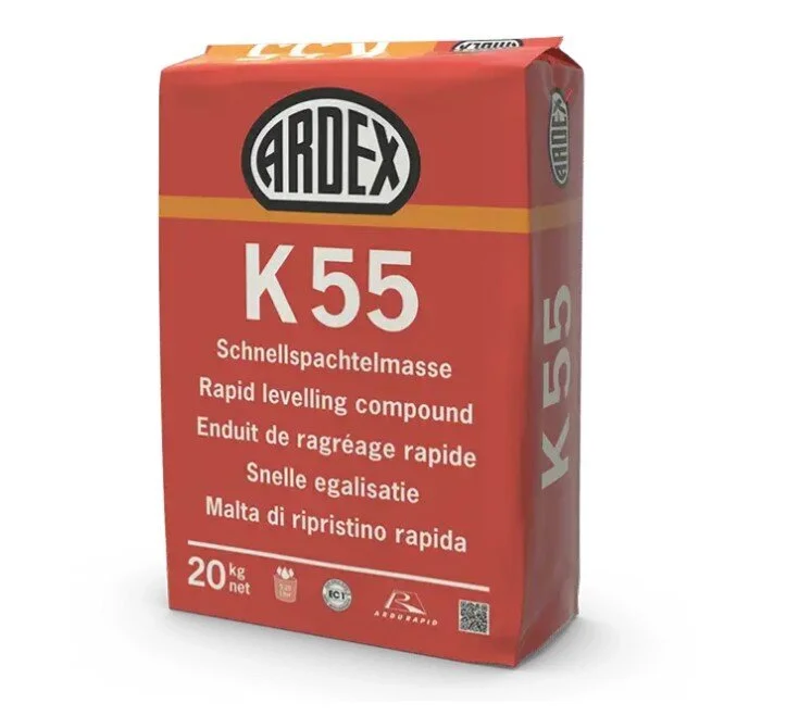 ARDEX K 55 är en blixtsnabb, självutjämnande, flexibel och cementbaserad golvspackel för renoverings- och reparationsarbeten samt andra uppgifter där torktiden är en avgörande faktor innan läggning av golvbeläggningar. Lämplig för spackling, avjämning och utjämning av råbetong, cement- och anhydritputs, gamla spackelmassor, gamla limrester, terrazzo, kakel- och klinkerbeläggningar m.m. ARDEX K 55 kan inte användas i områden med konstant vattenbelastning.