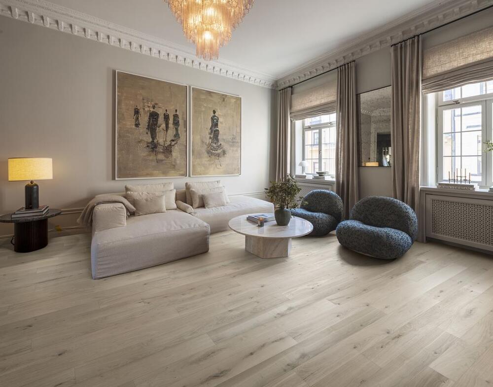 Loft White Plank, är inspirerad av vaniljglass med en aning grått. Pigmenteringen är applicerad i ett tunt lager för att framhäva träets kvistar och sprickor samt en ultramatt finish.
