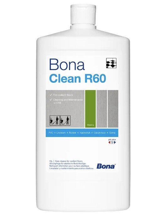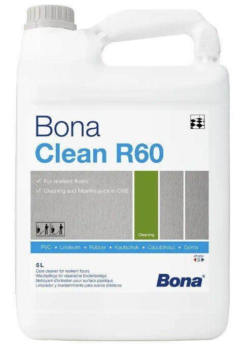 Bona Clean R60 är ett milt vattenbaserat underhålls- och rengöringsmedel för daglig rengöring av halvfasta golvbeläggningar. Bona R60, som är lämpligt för linoleum- och gummigolv, bildar en fin skyddande glans när produkten torkat.