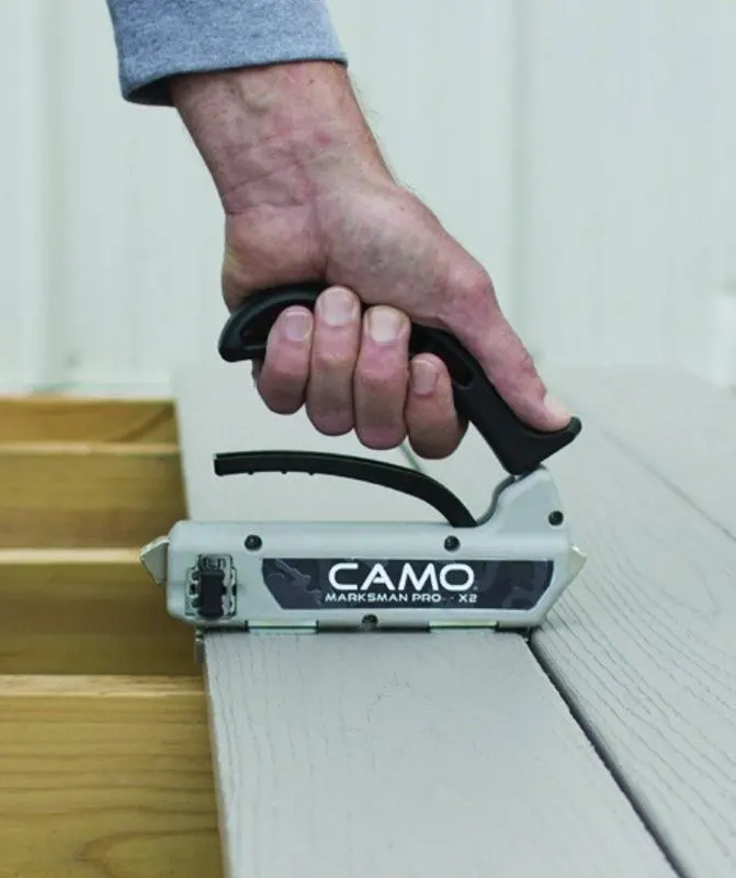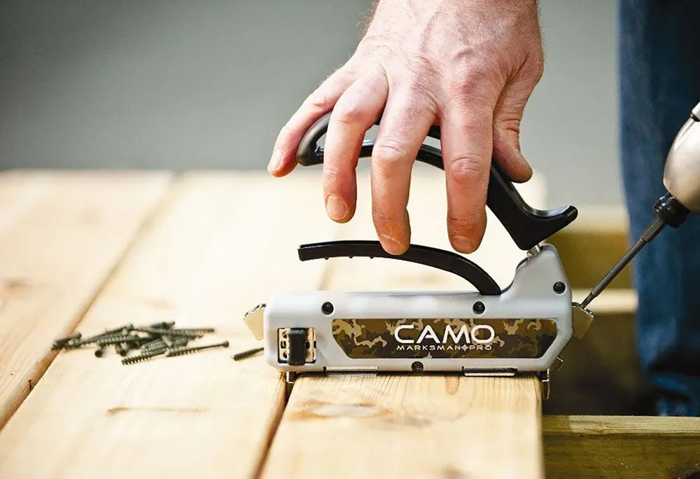 CAMO Marksman Pro - NB 5. Det revolutionerande och användarvänliga monterings-/fästeverktyget som gör det möjligt att montera trallbrädor utan synliga skruvhål. De specialdesignade CAMO-skruvarna, CAMO Hidden Fasteners, placeras i verktygets kammare och skruvas sedan in i trallbrädornas sidor. Avståndsklossarna på verktygets undersida ger automatiskt 5 mm mellan varje bräda. CAMO Marksman Pro - NB är ergonomiskt utformat och gör det enkelt att lägga ett snyggt trallgolv utan synliga skruvhål. CAMO Marksman Pro - NB kan endast användas med de originalspecialutvecklade skruvarna CAMO Hidden Fasteners.