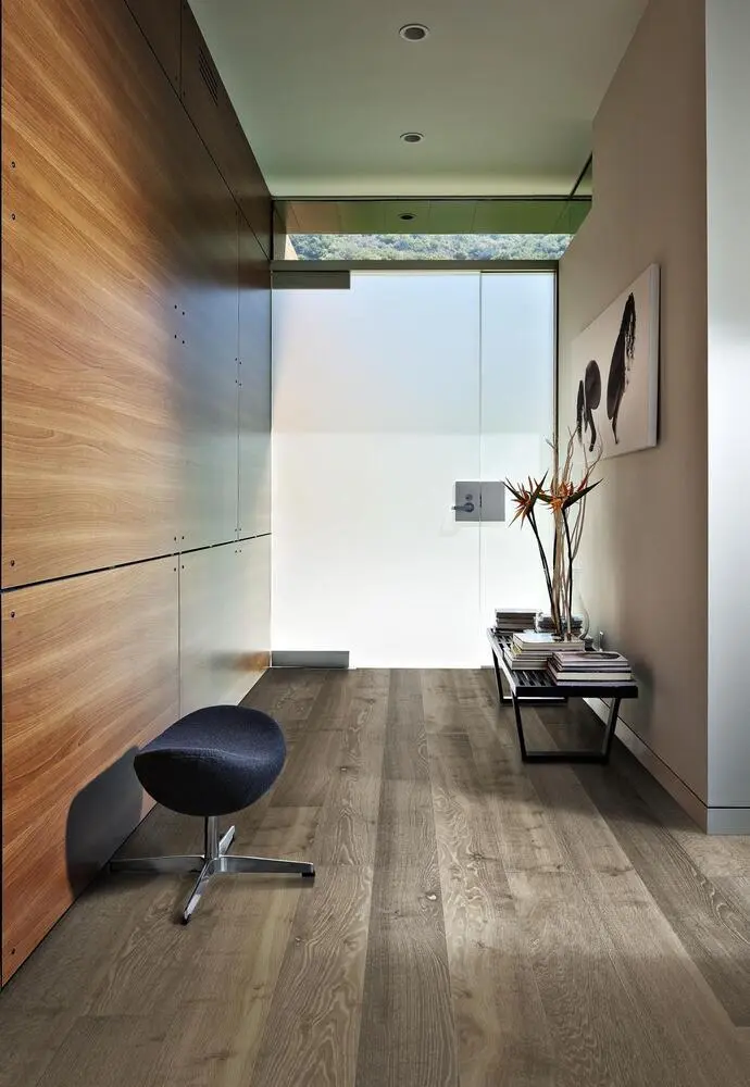 Ek Nouveau Greige, är ett klassiskt grått infärgat 1-stavs/plankgolv med mikrofasning. Ytan är borstad och för att tydliggöra strukturen ytterligare har man gett porerna en lättare grå ton. Den varierande strukturen i brädorna, kombinerad med både ljust grå och mörkare kvistar, ger golvet en genuin träkänsla.