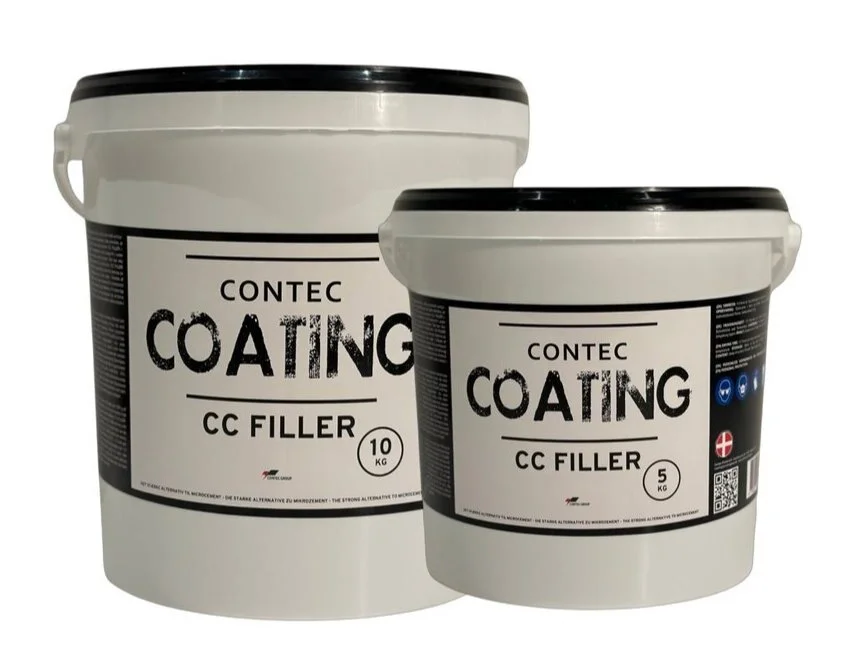 Contec Coating "CC-filler" er en stærk spartelmasse til sikring af bæredygtigt underlag for Contec Coating "PURE" – det stærke alternativ til Microcement. For at sikre plant underlag inden påføring af "PURE", kan det være en fordel at spartle underlaget op for at udjævne huller, fuger mellem fliser/klinker og lignende. Ved større huller eller fuger, kan man med fordel tilsætte op til 30% kvartssand til blandingen for at undgå at "CC-Filler" synker ved tørring. Husk at rengøre underlaget effektivt inden påføring af "CC-Filler", ligesom en slibning af underlaget kan være en fordel for at opnå bedre vedhæftning.