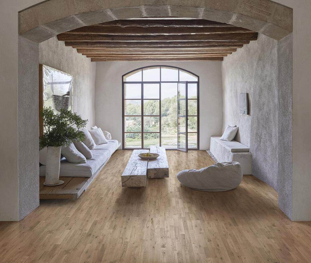 Ek Flint, ett modernt 3-stavs golv som skapar en varm känsla genom en diskret, mörk ton av naturlig ek. Liksom flinta med dess breda färgskala av nyanser har Ek Flint en tydlig kontrast, medan de varma grå undertonerna mjukar upp och skapar en enhet i designen. Den matta lackytan eliminerar glansen samtidigt som den skyddar träet mot dagligt slitage.