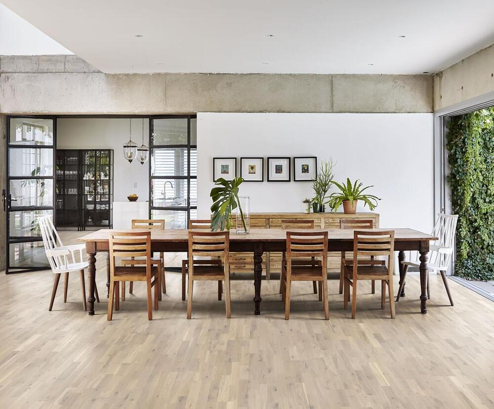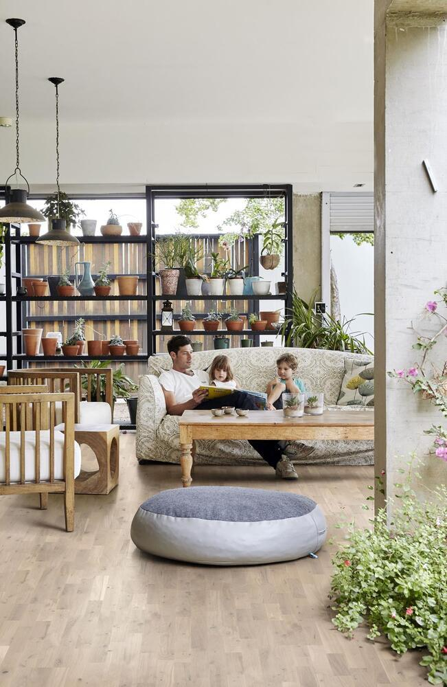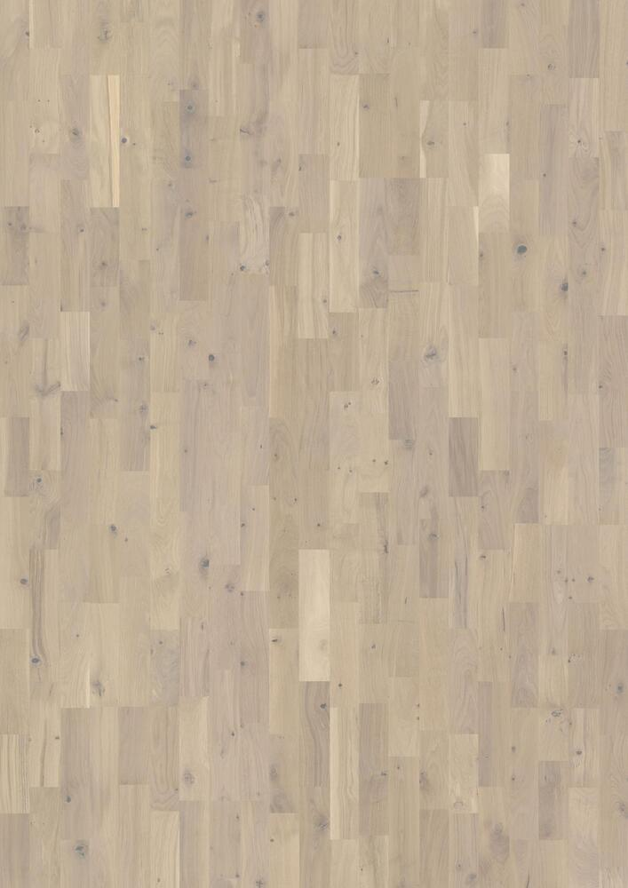 Ek Salt, inspiration från naturens milda nyanser, från vita toner till subtila ljusgrå och beige nyanser, ett modernt och ljust golv för alla inredningar. Den vita färgen på detta 3-stavs-golv dämpar variationerna och kontrasten i ekens kärnved. Den matta lackytan eliminerar glansen samtidigt som den skyddar träet mot dagligt slitage.