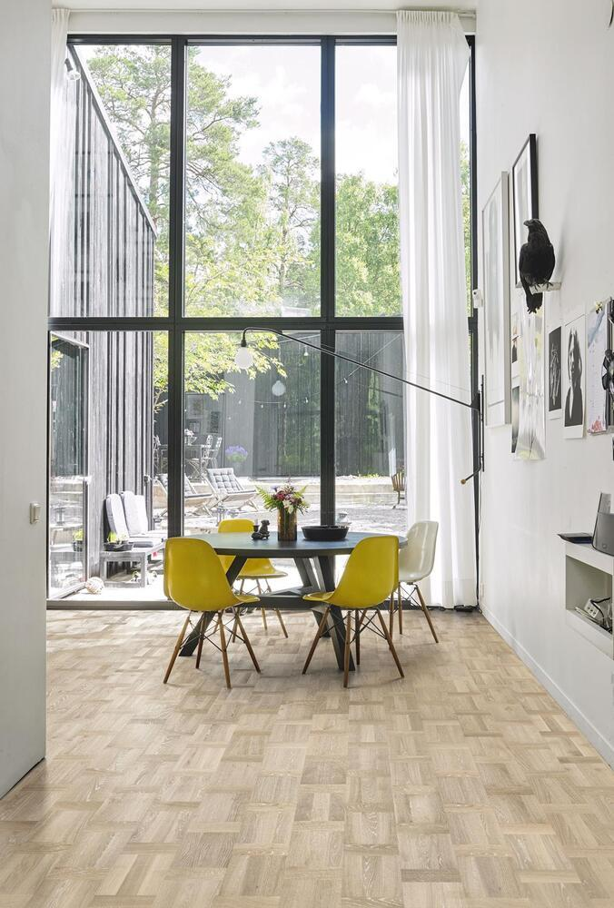Ek Palazzo Bianco, är ett vitpigmenterat golv med stavar i holländskt mönster. Golvet levereras som färdiga mönsterbrädor och installeras på samma enkla sätt som andra Kährs flerskiktsgolv. Var noga med mönstret vid läggning.