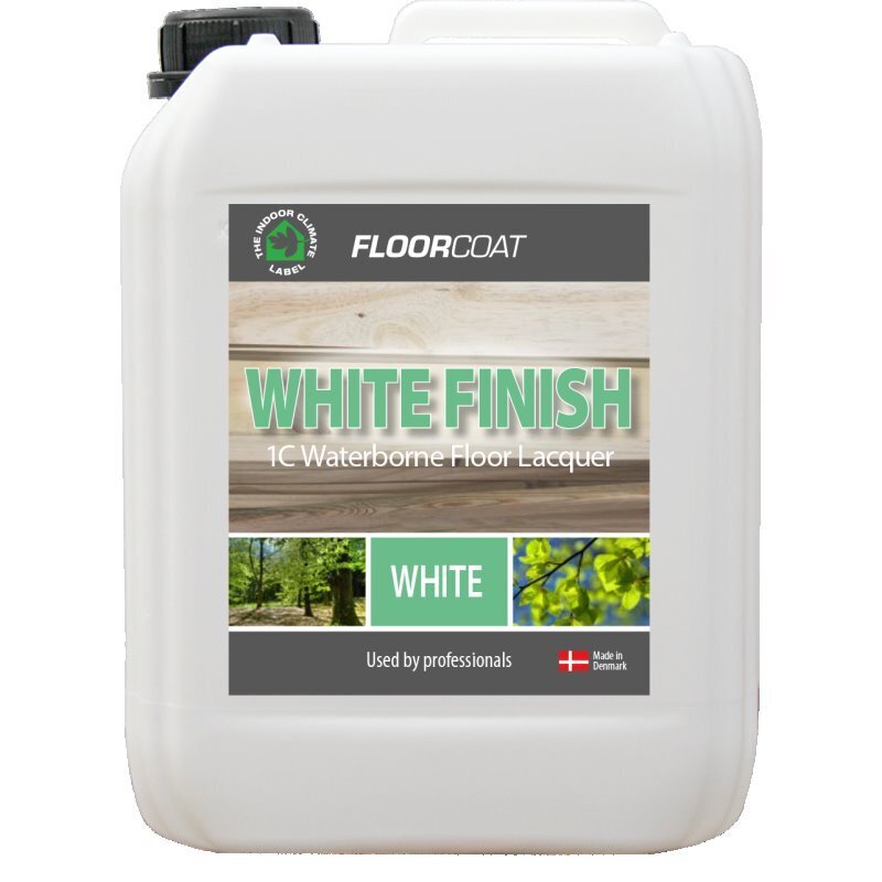 Floorcoat White Finish är en vattenbaserad vittonad topplack för användning på parkett-, bräd- och plankgolv där man önskar ett vitaktigt utseende. Det rekommenderas att grundbehandla med en Floorcoat grundningslack. Användning av grundlack i ett lacksystem, samt att uppnå ett stabilt klimat i rummen, minskar risken för sidelimning. Detta är dock ingen garanti för att sidelimningar kan undvikas, men risken minimeras.
