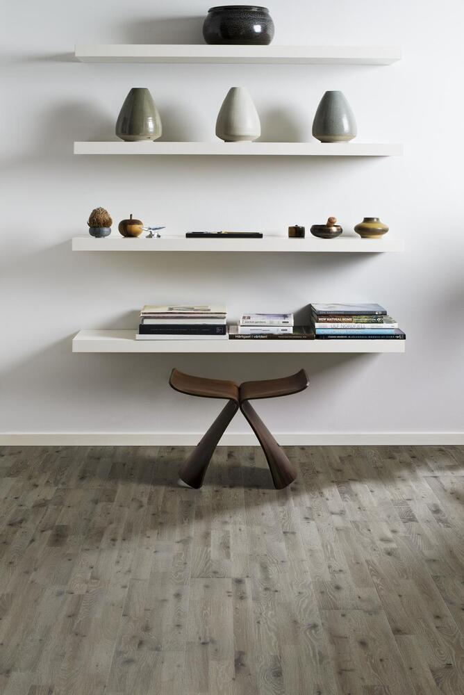 Ek Vinga, de kallare grå tonerna verkar vara utslitna och avslöjar en mer naturlig ektegel – Ek Vinga är en 3-stav med en vågig yta som framhäver träets naturliga struktur med synliga kvistar. Ytbehandlad med en gråpigmenterad olja, borstad, handskrapad, med sågmärken och fasade kanter. Ekens alla naturliga färgvariationer och stora kvistar utgör grunden för golvets rustika utseende. Observera att golvet ska installationsoljas med Kährs Satin Oil Matt omedelbart efter läggning.