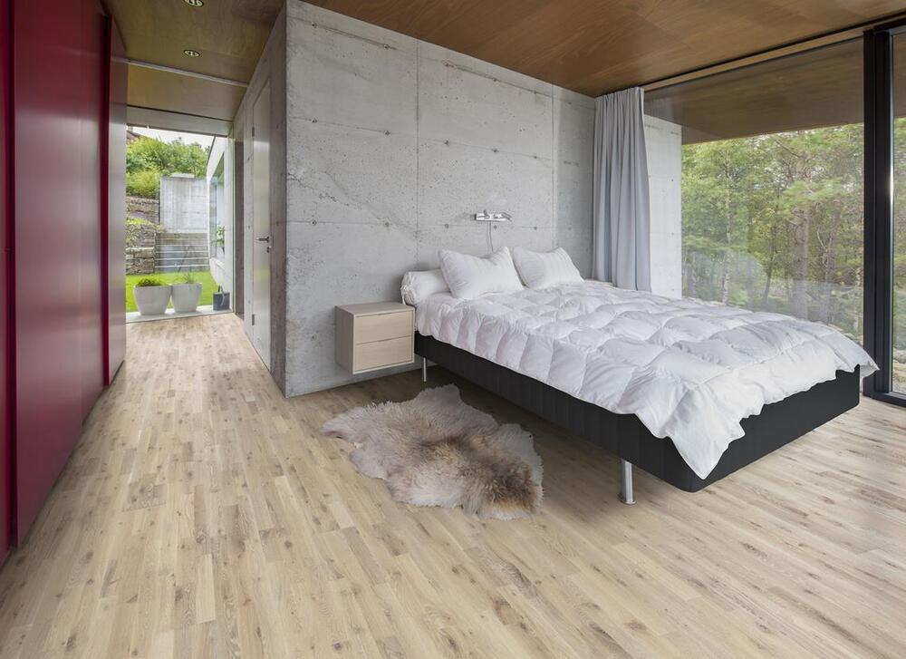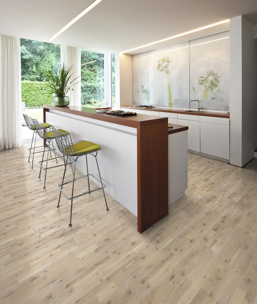 Ek Dew, en kombination av golvets särpräglade trästruktur tillsammans med den vita patinan från naturoljan bidrar till en fräsch omgivning.