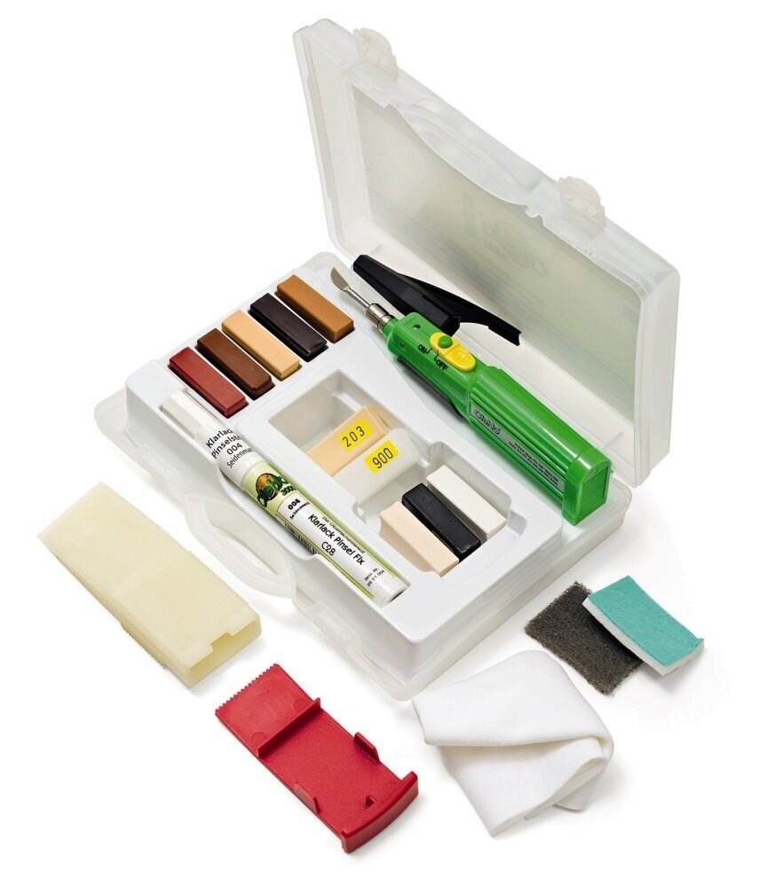 Reparationsset med hårt vax C13 för snabb och fackmässigt korrekt reparation av tryck- och repmärken. Används på Haro golvbeläggningar och andra trä- och plastytor.