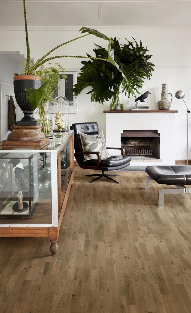 Ek Ore, påminner om den varma, mörka jorden där malm bryts. En rik, varm ton som skapar en lugnande och trygg bas. Den fina variationen i färg och nyanser skiftar från ljust till mörkt samtidigt som den skapar en enhet genom den mjuka, bruna färgningen. Den matta lackytan eliminerar glansen samtidigt som den skyddar träet mot dagligt slitage.