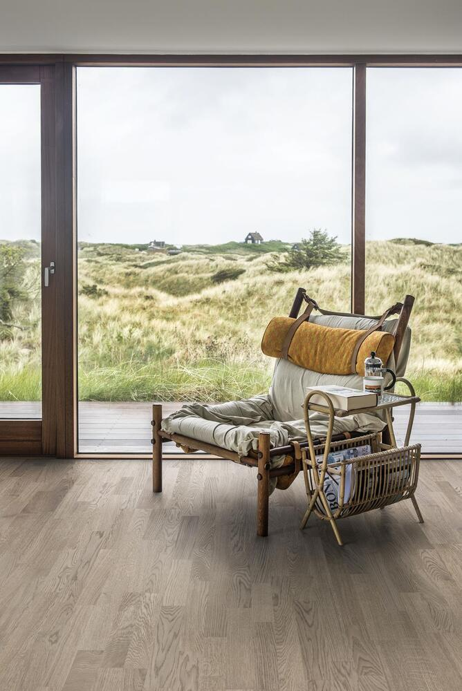 Ek Eclipse, de mineralgrå tonerna i detta 3-stavs-golv i ek från Lumen-kollektionen är "översvämmade" av sten- och diskreta jordfärger, vilka uttrycksfullt kompletteras av en ultra-matt lackfinish. Varje bräda är varsamt borstad till perfektion, vilket framhäver ådringens naturliga karaktär. Den ultramatt lacken framhäver träets naturliga variationer och får golvet att likna nyligen sågat virke. Detta eliminerar effektivt bländning och skyddar golvet mot dagligt slitage.