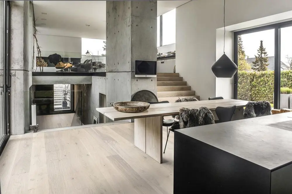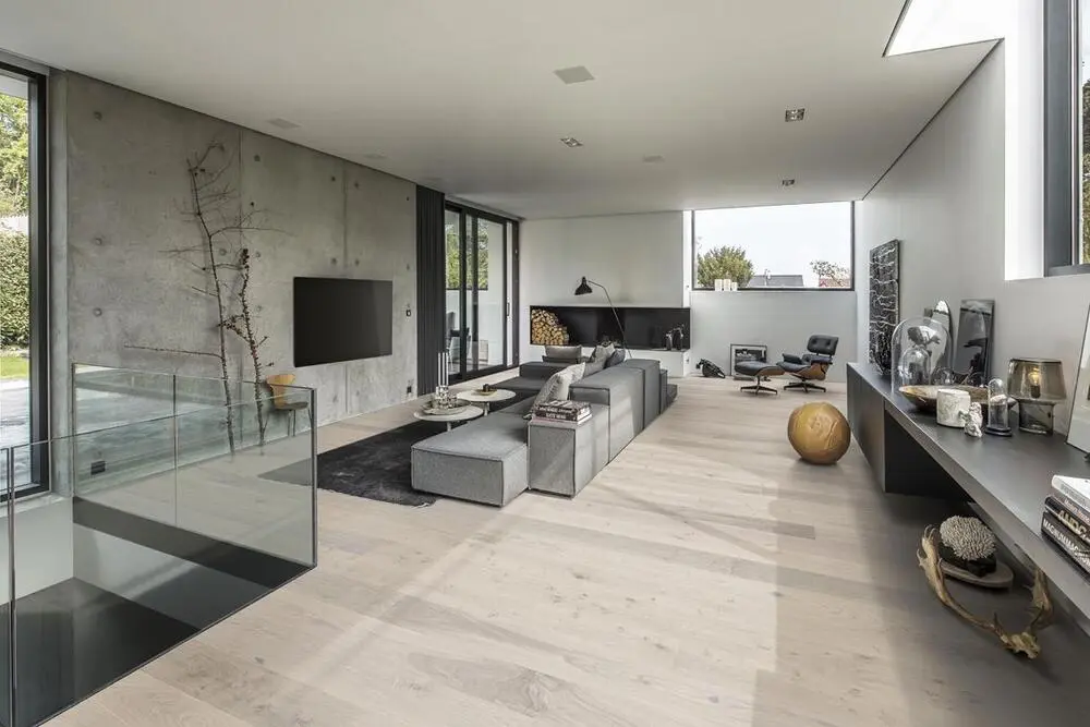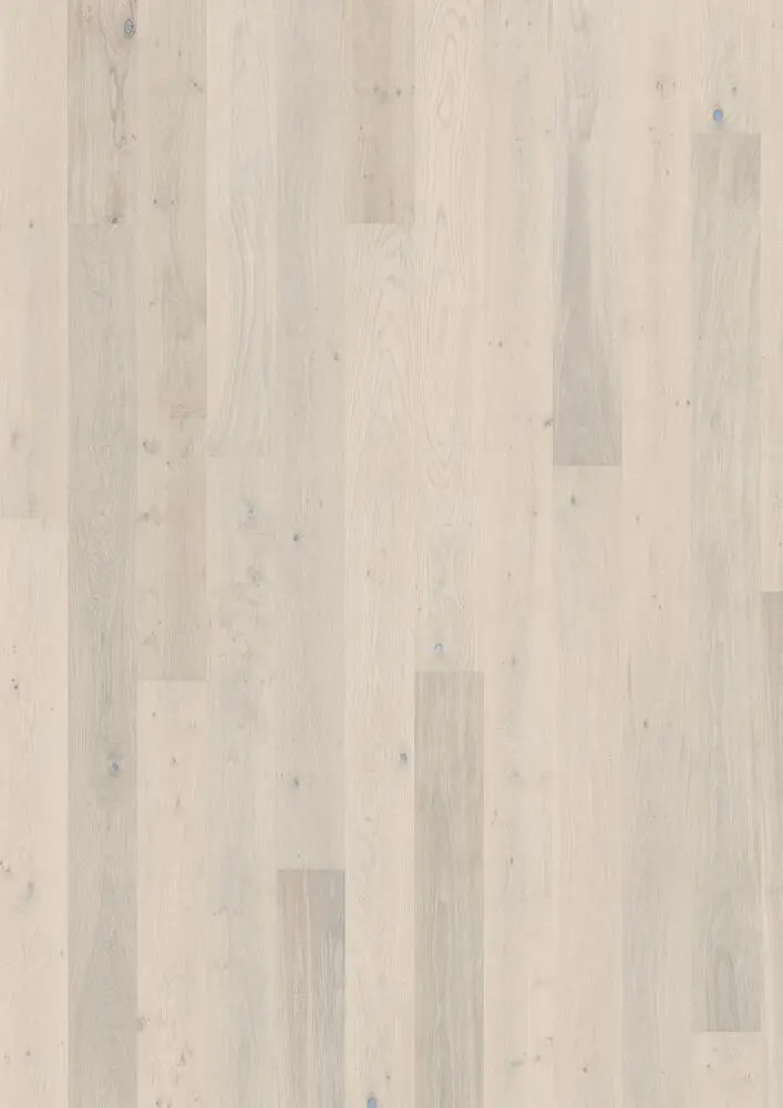 Ek Sky, den halvtransparenta vitlaseringen av detta 1-stavs-golv i ek från Lux-kollektionen skapar balans mellan trädets ljusa och mörka kontraster, så de raffinerade, varma färgtonerna i ekträet framträder mjukt. Den fyrsidiga mikrofasningen vid kanten ger ett klassiskt helplankutseende. Varje bräda är försiktigt borstad till perfektion, vilket framhäver ådringens naturliga karaktär. Den ultramatt lackeringen framhäver de naturliga variationerna i träet och får golvet att likna nysågat timmer. Detta eliminerar effektivt bländning och skyddar golvet mot dagligt slitage.