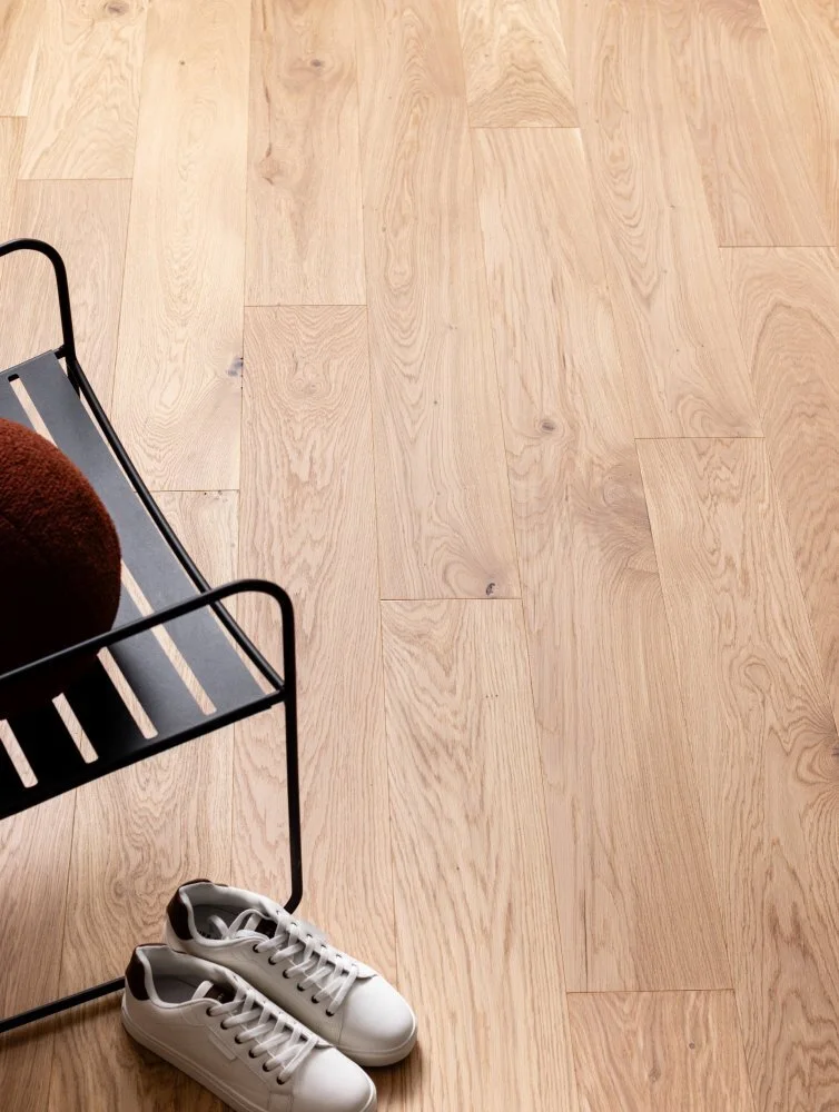 Upptäck Unilame i fransk ek, ett golv med fasta längder som är förädlat med en bois flotté-ytbehandling och en matt lackering. Den tidlösa färgtonen ger en diskret och raffinerad elegans som passar perfekt både i klassiska och moderna inredningar. Med sin unika ytbehandling utstrålar golvet mjukhet och lugn, och förvandlar varje rum till en inbjudande och varm hemmiljö.