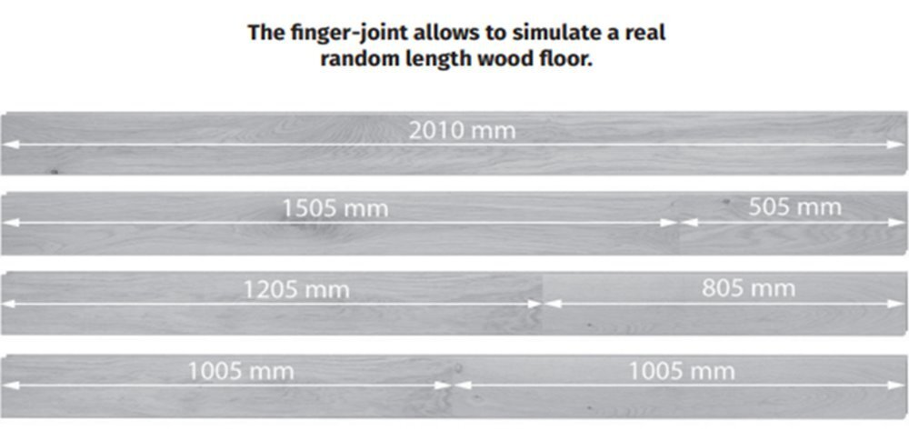 Innehåll per paket: 1,85 m², 5 plankor - Plankorna levereras med "fingerskarvat" toppskikt, se illustration på bilder. Fingerskarvningen gör det möjligt att simulera ett äkta trägolv med slumpmässiga planklängder.