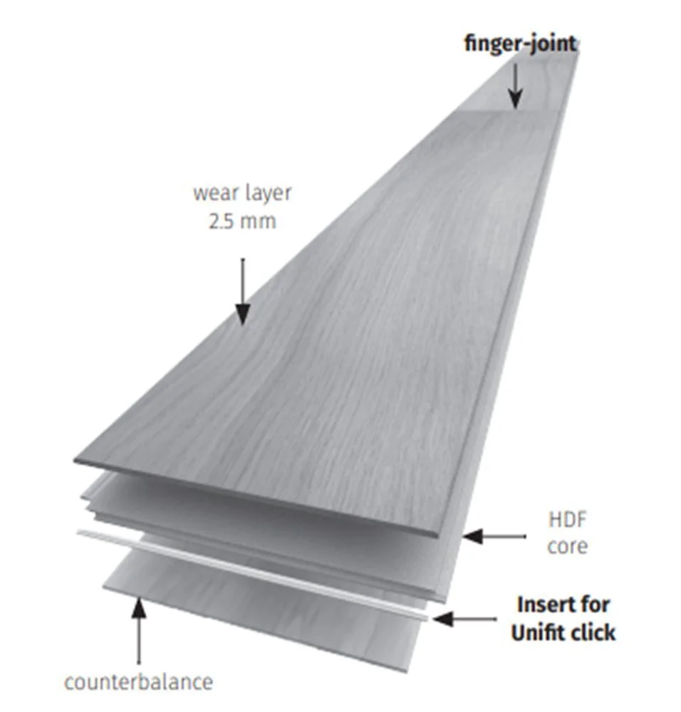 Uppbyggnad: 3-lagers uppbyggnad med stabilt HDF-mellanlager.
