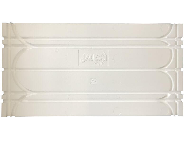 Jackons 2-i-1 golvvärmeplatta är designad med plats för värmeslangar både Ø16 och Ø20 mm. Värmefördelningsplåtar och värmeslangar läggs i plattans spår och behöver inte fästas ytterligare. Detta säkerställer en enkel och snabb montering. Golvvärmeplattan är tillverkad i EPS och finns i 30 mm tjocklek som standard. Plattan lämpar sig väl för flytande golv och med en tryckstyrka på 250 kN/m2 kan golvvärmeplattan användas under i princip alla typer av övergolv. Samtidigt är plattan lätt i vikt och enkel att anpassa.