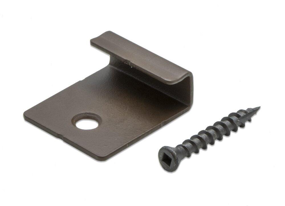 Ändclips för Bambus X-treme trallbrädor. Start-/slutclipsen kan monteras på alla fria sidor av altanen så att det inte är nödvändigt att skruva det sista brädet med synliga skruvar. Clipsen och skruvarna är målade bruna för att synas så lite som möjligt efter montering.