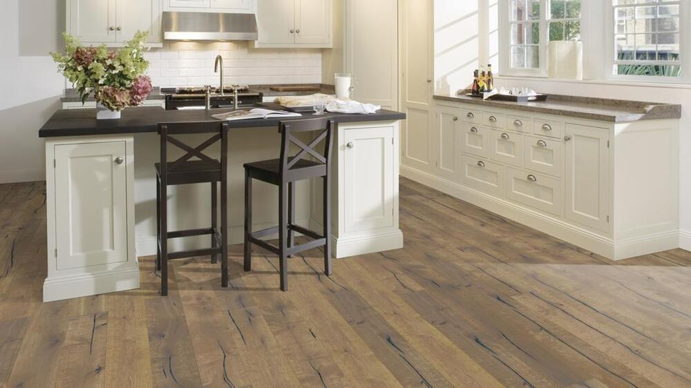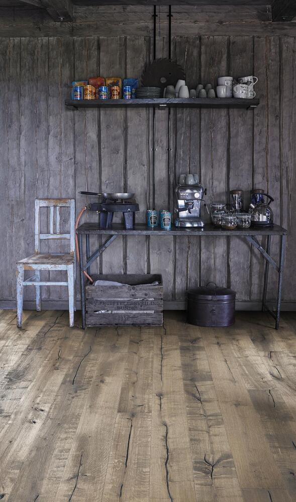 Handbörd, slitet utseende med grå nyanser över en rökig och borstad botten. Handbörd är ett mycket rustikt golv med kvistar, sprickor och utfyllnader.