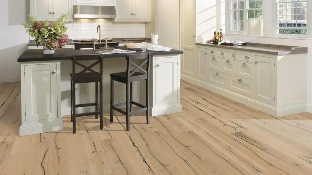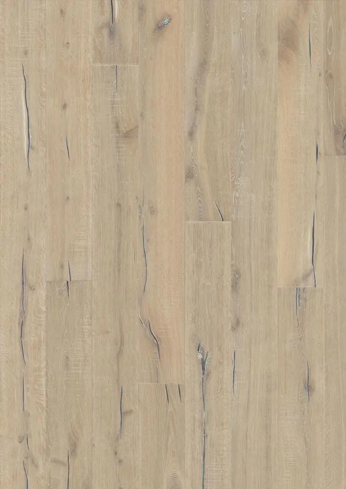 Aspeland, ett golv med slitage i ljusa färger. Aspeland är ett mycket rustikt golv med kvistar och sprickor som ger det ett åldrat, renoverat utseende. Naturliga variationer i träets färg kan förekomma, från ljusbrun till mörkbrun.