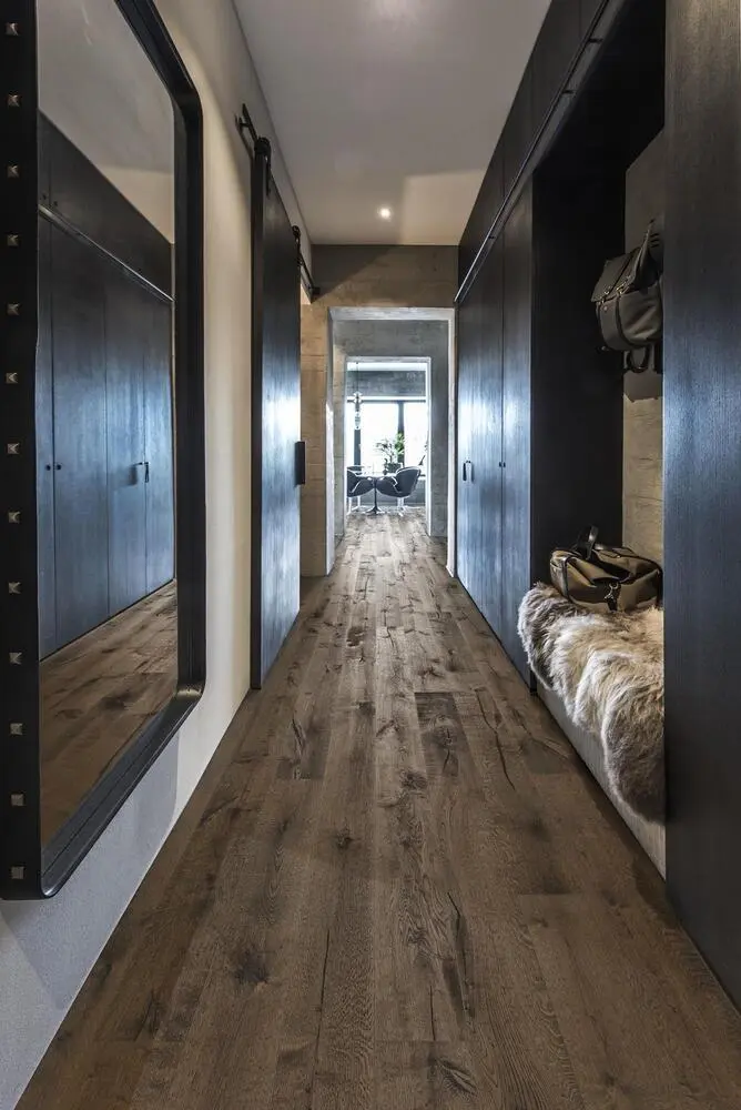 Tveta, mörka skiftningar i träkolstoner och en underliggande glöd av varma nyanser. Tveta är ett mycket rustikt golv med kvistar och sprickor.