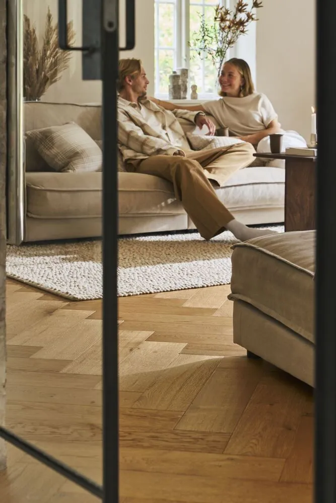 Charlottenlund är ett traditionellt sillbensgolv, men i en vacker accent-sortering som tillför extra karaktär och liv åt golvet. Golvet rymmer både det estetiska, det klassiska och det moderna. Charlottenlund accent varierar med ljusa och mörka stavar, samtidigt tillåter sorteringen kvistar som ger det sista åt golvytan. Stavar är borstade för att framhäva träets ådring och gör ytan mindre känslig för repor. Golvet är behandlat med 8 lager ultramatt lack i natur - glansgrad 5.