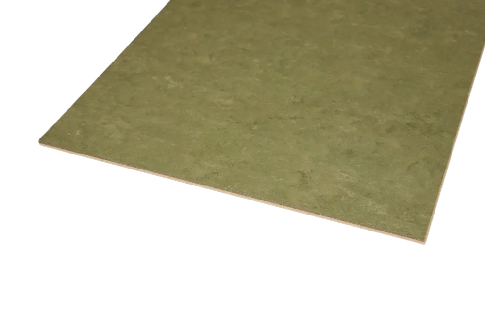 Linoleumplattorna är uppbyggda med 1,2 mm korkbaksida, 6,8 mm HDF-mellanlager och 2 mm slitstarkt linoleumskikt ovanpå. På grund av korkbaksidan behöver inget ytterligare underlagsmaterial läggas under golvet, endast ångspärr där det är nödvändigt.